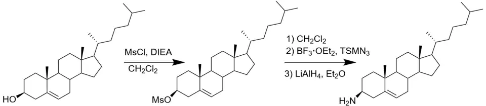 3. ^ a b c Sun Q, Cai S, Peterson BR (February 2009). "Practical synthesis of 3beta-amino-5-cholestene and related 3beta-halides involving i-steroid and retro-i-steroid rearrangements". Organic Letters. 11 (3): 567–570. doi:10.1021/ol802343z. PMC 2651230. PMID 19115840.