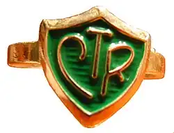 The letters CTR, a reference to this phrase, are incorporated into a shield logo designed by Joel Holbrook Izatt[2] Margery Cannon and Lurene Wilkinson[3] who were Primary General Board members in the 1960s. In 1970, a church committee headed by Naomi W. Randall recommended that the shield be incorporated into official church material. Since then, both the phrase and symbol have been used in religious educational materials for LDS youth of Primary age.[4] The symbol is also used in LDS culture by members of all ages, both as a reminder of the motto, as well as an indicator of religious affiliation. The CTR initials, displayed on the shield and in other forms, can be seen mainly on CTR rings as well as other types of jewelry, tee shirts, bookmarks and stationery.