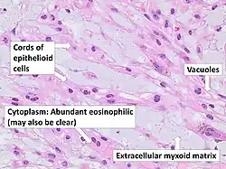 - The histological appearance of classical chordoma is of a lobulated tumor composed of groups of cells separated by fibrous septa. The cells have small round nuclei and abundant vacuolated cytoplasm, sometimes described as "physaliferous" because of their cytoplasmic vacuoles, and their resemblance to the physalis plant.