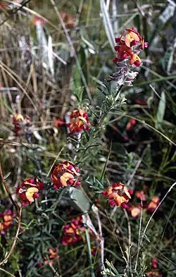 Chorizema cytisoides is a species of flowering plant in the family Fabaceae and is endemic to the southwest of Western Australia. It is an erect to low-lying or sprawling shrub with linear leaves and reddish-orange, yellow and purple flowers.