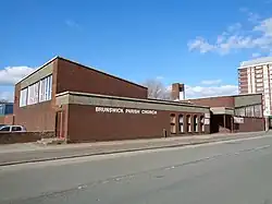 The oldest Roman Catholic church in Chorlton-on-Medlock was the Church of the Holy Name on Oxford Road (built between 1869 and 1871), a fine example of the work of the architect Joseph Aloysius Hansom. St Augustine's, Granby Row (demolished in 1908 to allow expansion at the Municipal College of Technology) was replaced by a second St Augustine's in York Street, Chorlton-on-Medlock (ruined by German bombing in 1940 during World War II):[9] its successor is at Lower Ormond Street on the Manchester Metropolitan University campus in a building which serves also as a chaplaincy to the University. This church was built in dark brick to the designs of Desmond Williams & Associates in 1967–68.[10] It replaced an earlier church of the Holy Family which was at first a chapel-of-ease to St Augustine's, then an independent parish, but a chapel-of-ease again from 1908 to 1940 when it became the parish church of St Augustine's parish.[11]