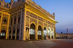 The Chhota Imambara stands to the west of Bara Imambara and an imposing gateway known as Rumi Darwaza.[2] The building is also known as the Palace of Lights because of its decorations and chandeliers during special festivals, like Muharram.[3]