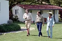 On May 18, 1985, as part of an NBC News special, Wallace did a joint interview with Ronald Reagan and Nancy Reagan at Camp David.[32] Some journalists have described Wallace's style as confrontational. During President Ronald Reagan's news conference in March 1987, when Reagan admitted to dealing arms for hostages, Wallace asked Reagan why he had denied that Israel was involved with the arms sales to Iran "when you knew that wasn't true."[33] In 1988, Wallace covered the 1988 Republican National Convention for NBC News, where he interviewed political figures, including real estate tycoon Donald Trump questioning him about flirting with running for political office.[34]