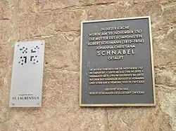 In her last letter to Robert Schumann on December 13, 1835, Christiane Schumann described in detail her physical and mental suffering as well as her "long experiences and hard trials" in this regard. In her will of January 27, 1836, she named her "dear children and grandchildren" Eduard, Carl, Robert, Emilie, Richard and Mathilde Schumann as heirs with many detailed provisions "according to the legal order of succession".[22] On 4 February 1836 Christiane Schumann died in Zwickau. In 2012, the Zwickau Schumann Society had a memorial plaque installed in her honor at the Protestant church of St. Laurentius in Karsdorf, where she had been baptized as Johanna Christiana Schnabel on 30 November 1767.[23]