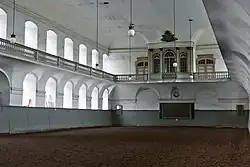 The interior is more or less unchanged since the construction in the 1740s. It is equipped with a balcony and a royal box to allow audiences the possibility to attend exercises and performances. The royal box is unique as it is the only royal room preserved from the first palace.
