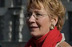 Hamilton spent many years working as secretary to various Conservative MPs, first Wilfred Proudfoot MP for Brighouse and Spenborough, then Gerald Nabarro, MP for South Worcestershire.[7] She stood behind Nabarro as he spoke on the steps of Winchester Court after being cleared on appeal of a motoring offence.[7] Hamilton worked as her husband's secretary following their 1983 marriage. Neil Hamilton eventually reached the post of Minister for Corporate Affairs between 1992 and 1994 in Prime Minister John Major's government. Neil Hamilton became embroiled in the Cash-for-questions affair, and the former BBC broadcaster Martin Bell stood against him for the Tatton seat at the 1997 general election. Bell campaigned as an ‘anti-sleaze’ candidate, and Christine Hamilton confronted him during a televised press conference on Knutsford Heath, which brought her to public prominence.[8] Hamilton later described the confrontation with Bell as "...the making of me."[8] The journalist John Sweeney later published Purple Homicide, an account of the campaign for the Tatton seat.[9] Neil Hamilton's later failure in a libel case against the Egyptian businessman, Mohamed Al-Fayed,[10][11] would lead to her husband's bankruptcy. Their home in Nether Alderley, Cheshire was sold to the market for £1.25 million.[12][13][14]