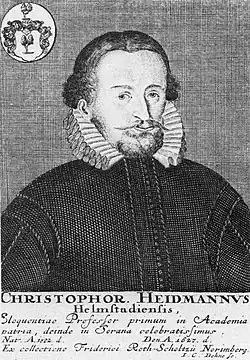 Born and raised in Helmstedt (Bodenwerder?), Christoph Heidmann studied in Helmstedt from 1602 and in 1612 received a professorship in rhetoric at the University of Helmstedt (also known as the Academia Julia ). As a university professor, he introduced students such as Hermann Conring and Christoph Schrader to philology. Schrader was appointed to Heidmann's chair in 1636, a decade after Heidmann's resignation.