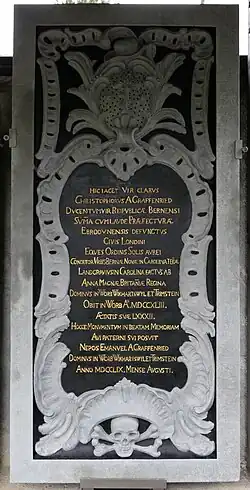 In 1731, Anton von Graffenried sold to his son Christoph the management of the estate which went with the office, reserving for himself the revenues of the office. The management of the estate was not very lucrative, but the father thought he had made a rather generous settlement for his spendthrift son. Later, when Anton became Mayor of Murton he wanted a representative in Iverton; and although Christoph did not relish the place, still to please his wife he ran for it and was elected. In 1730 at Anton's death the estate of Worb came to Christoph without encumbrance, and he held it till 1740, when he retired in favor of his sons. Three years later, in 1743, Graffenried died and was buried in the choir of the Church at Worb.[21]