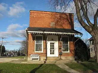 Built in 1890 in the Italianate style of architecture,[1] Layman's law office is a brick building with a foundation of limestone plus various sandstone elements.[3] Rather than the grand construction found in many Italianate buildings, the Layman Law Office is a modest commercial structure. Here Layman fulfilled many responsibilities: besides serving as the village's first lawyer, he held office as a justice of the peace and became an agent for multiple insurance companies.[2]