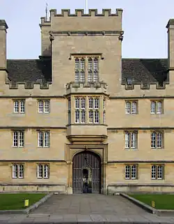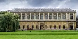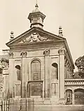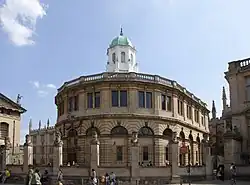 Wren's second, similarly collegiate work followed soon after, when he was commissioned to design Oxford's "New Theatre", financed by Gilbert Sheldon.[46] His design for the structure was met with lukewarm to negative reception, with even Wren's defenders admitting the young architect to have not yet been "capable of handling a large architectural composition with assurance".[14] Adrian Tinniswood credits the building's flaws to "Sheldon's refusal to pay for an elaborate exterior, Wren's inability to find an adequate external expression for a building which was wholly conditioned by the functionality of its interior space and, ...his refusal to bend the knee to classical authority in the way that our experience of eighteenth-century architecture has conditioned us to believe is right."[14] Prior to the theatre's 1669 completion, Wren had received further commissions for the Garden Quadrangle at Trinity College, Oxford, and the chapel of Emmanuel College, Cambridge.[14]