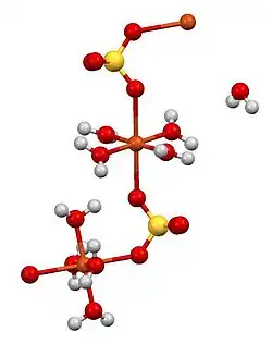 In aqueous solutions chromium(II) sulfate forms metal aquo complexes, presumably with six water ligands. The structures of the crystalline salts are similar to the corresponding hydrates of copper(II) sulfate: pentahydrate, trihydrate, monohydrate, and anhydrous derivatives of chromous sulfate are known. In all of these compounds, the Cr(II) centre adopts octahedral coordination geometry, being coordinated to six oxygen centers provided by a combination of water and sulfate ligands.[4][5]