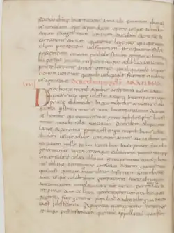 None of the copies is the autograph and all include changes introduced to the text between 801 and 814.[17] Three of the manuscripts contain the whole chronicle, while the other three contain only parts. All but the Brussels manuscript incorporate the Chronicon (or part of it) into Bede's Reckoning of Time (of which his Chronica maiora is an integral part). The Besançon and Leiden copies have been called a "first edition" and the Munich copy a "second edition", since it was expanded with further additions.[9] The Munich text, although twice as long, does not extend beyond 741. It introduces the Chronicon section with the rubric INCIPIT LIBER CHRONICORUM EX DIUERSIS OPUSCULIS AUCTORUM COLLECTA IN UNUM ('[here] begins the book of the chronicles [taken] from the diverse works of authors collected in one').[15]