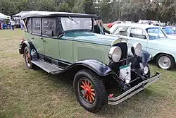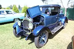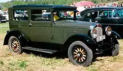 The Chrysler Six Model B-70 is a full-size car that was the first car produced by Chrysler from 1924 to 1925. It was the first model produced under the Chrysler brand. It replaced the cars of Maxwell, whose brand was bought by Walter Chrysler in 1921. Nine different bodies supplied from Fisher Body Co. were offered in the first year of production. The open cars initially had horizontally split windshields inspired by the Brewster windshield and 30 in (762 mm) wheels with five lug nuts attached to hydraulic four-wheel drum brakes.[3] The success was sensational: 32,000 cars had been sold by the end of 1924, a new record for the introduction of a new model.[4] With the introduction of the B-70, the production of the Chalmers was stopped.[3] The entry level Roadster with rumble seat was available for US$1,595 ($29,264 in 2024 dollars [5]), while top model documented was the Town Car listed at US$3,725 ($68,345 in 2024 dollars [5]). The new Chrysler offered several items, technology and body style choices that had become extra cost items from other manufacturers that Chrysler included for no extra cost, while it was priced in the medium price field.[3]