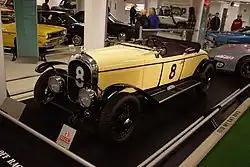 Production year 1929 introduced two series platforms as the Chrysler Six, with the Series 65 with a 112.75 in (2,864 mm) wheelbase and the Series 75 had a 121 in (3,073 mm) wheelbase. Both Series shared narrow profile radiators and the cowl height was increased. The ignition switch was upgraded to a keyhole, and the crown depth of the fenders over the wheels was lengthened, and built-in adjustable radiator shutters were introduced as well. The color combination of the dashboard was how the different series could be distinguished, with silver and black for the Series 65 and gold and black for the Series 75. Delco Remy Lovejoy hydraulic shock absorbers were now available on all Series. Coachwork choices were reduced for the Series 65 and added to the Series 75, listing five coupe selections and seven sedan choices, listing four separate convertible sedan options.[3] One Series 75 and one Series 77 roadsters were again entered in the 1929 24 Hours of Le Mans, where both were driven by the same French teams from the previous year and finished sixth and seventh in their class, which only consisted of three Bentley 4½ Litres.[3]