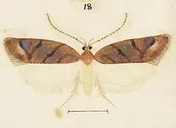 ♀. 10 mm. Head, palpi, and thorax ochreous. Antennae ochreous on basal fifth, annulated with white and black on remaining portion. Abdomen greyish-white. Legs, anterior pairs fuscous, tarsi obscurely annulated with ochreous, posterior pair ochreous-whitish. Forewings moderate, costa strongly arched, apex round-pointed, termen moderately oblique; bright ochreous with violet and purplish reflections; a brownish fascia from beneath costa near base to dorsum at 1⁄4; a well-defined fascia from costa at 1⁄4 to dorsum at 1⁄2, slightly irregular, brownish mixed with black; a similar fascia from costa at 2⁄5, strongly angled above middle towards termen, thence to dorsum at 2⁄3, where it coalesces with inwardly-oblique fascia from costa at 3⁄4, both these fasciae having black patches at middle; a white patch margining last fascia at middle; a few black scales on central portion of dorsum : cilia ochreous, becoming fuscous round apex. Hindwings and cilia shining white.[4]