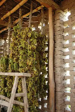 In Turpan, raisins are primarily produced from seedless white grapes.[1] The drying process takes about 40 days. Grapes that have been dried in a drying house (the "air-dried" kind) usually appear green or yellow, because of the shade, while grapes dried under direct sun appear dark.[3]