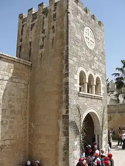 The crusader era chapel itself was built on the foundations of a 4th-century Byzantine shrine commemorating the meeting between Lazarus' sister Martha and Jesus.[1] In 1867, during construction of a Franciscan monastery on the grounds, a stone, cube shaped and covered in plaster, was discovered. This stone, now called the Stele of Bethphage, was an integral part of the 12th-century crusader chapel and now lies near the northern wall of the church. The Crusaders had decorated the stone and inscribed upon it in Latin, descriptions of biblical events which occurred in the area of Jerusalem and Bethphage. In 1950 the decorations on the stone were restored and five years later, in 1955, frescos were drawn on the walls and ceiling of the sanctuary. Today, as in the 12th century, pilgrims hold a Palm Sunday procession which begins at the Bethphage Church.[2][3]