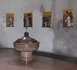 Fourteen shining gold Stations of the Cross in Neo-Romanesque style stand out from the soot-stained and colorless walls of the dome.[9]