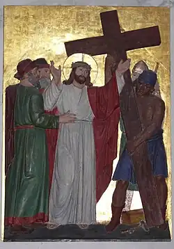 The wooden figure of the church patron Saint Rupert still remains from the former high altar, and the figure of the Virgin Mary from a side altar.[7] The right side altar, formerly St. Joseph's altar, now the sacrament altar, shows scenes from Jesus' childhood in the antependium relief of the altar bar. The bronze tabernacle was created by Josef Hamberger.[8]