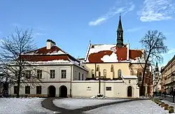 The original Church of St. Giles was constructed on the orders of the Duke of Poland, Władysław I Herman in the 11th century. It was done as a result of his wife Judith of Bohemia giving birth to a son, which was attributed to the intercession of Saint Giles.[2] The current church building was reconstructed in the 14th century and later remodelled in 1595 when it was handed over to the Dominican Order.[2] By the start of the 20th century, a number of ancillary buildings had been constructed around the church. In 1905, the Krakow City Council passed an ordinance authorising the demolition of these buildings. This was objected to by heritage groups and Count Mycielski, who allegedly utilised his friendship with Archduke Franz Ferdinand, which resulted in the ordinance being withdrawn but demolitions still occurred leaving only three 18th century houses.[3] These houses were subsequently demolished by the Nazi General Government during the German occupation of Poland.[4]
