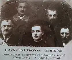 The construction of the church started in 1918 after Lithuania re-established its independence. However, after the walls of 2.5 m height were built, the construction stopped. The works began to continue only in 1929 and the construction was completed in 1933.[1] Because of lack of money and in order to finish the project, constructors of the church refused exterior decoration foreseen in the primary projects. Consequently, the outside walls were made only of concrete.[2]