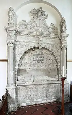 In the chancel is a highly decorated monument with a recumbent effigy of Sir John Jefferey, who died in 1611. The memorial features fluted columns and ornately carved strapwork with cornucopias, fleurons, masks and other motifs.[24][25] Nearby is the tomb of John Wadham of Catherston, from a collateral branch of the family later to found Wadham College, Oxford. He was "Captain of the Queen's Majestie at Sandesfoot Castle", MP for Weymouth and Recorder of Lyme, and died in 1584. It is a plain tablet of two panels with a tall pediment decorated with a cluster of circles.[24]