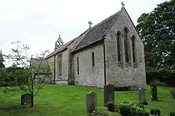 The Cotswold stone building has a stone slate roof. It consists of a three-bay nave and two-bay chancel with a south porch. The bellcote on the west gable has two bells.[1]