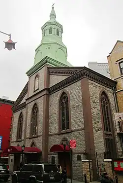 The church is one of four on the Lower East Side built from Manhattan schist.[4] The AIA Guide to New York City describes it as "[A] Georgian church with Gothic (small-paned double-hung) windows ... with Gothic tracery ... Dressed Manhattan schist makes neat building blocks, with brownstone detail."[6] A copper-covered octagonal tower designed by Henry Engelbert was added to the church building in 1868,[7][6] when the Gothic windows are assumed to have been added as well.[4] The church was designated a New York City landmark in 1966, and was added to the National Register of Historic Places in 1980.