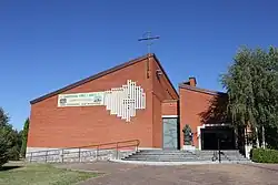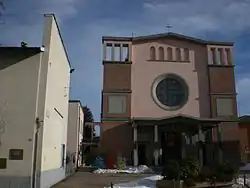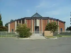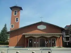 After an unfinished design by the Busto architect Enrico Castiglioni,[50][51] the church was built starting in 1973 according to the design of the model churches.[52] It has two naves of different sizes covered by a single-pitch roof. The bell tower is covered by a single-pitch roof. The church was blessed in 1975 and consecrated the following year.[53]