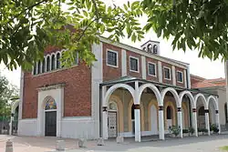 The bell tower does not rest on the ground but rises from the center of the tripartite façade.[32] Originally the façade was made of exposed brick: its present appearance dates from 1933. Inside it has three naves and a square chancel. Some 18th-century paintings are also preserved there.