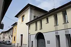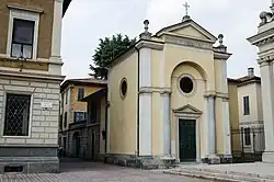 The square in front of the church was created by demolishing some pre-existing buildings and using the area of the old cemetery, predating the one that was later built just outside the village, in what is now Ugo Foscolo Park.[13] Two other fine buildings overlook the same square: the recently restored Volonterio palace and the Varese credit.