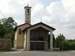 Erected in the existing meadow near the bifurcation between the roads that led to Gallarate (on the right when looking at the church façade), and to Verghera and Arnate (on the left), its current layout is the work of Canon Biagio Bellotti who, between 1773 and the following year,[66] modified the 16th-century church. The church, which had already been enlarged in 1584, was built to replace a 14th-century shrine that featured a painting of the Virgin Mary suckling Baby Jesus.[67] Bellotti repainted the fresco above the original, later found during recent restoration work. Also his are the three statues placed at the top of the church's facade.