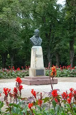 After Poland regained independence after World War I in 1918, the spa was taken over by the Polish Government and subordinated to the Ministry of Health.[6] During this period, healing facilities destroyed during the war were rebuilt, new pensions, a post office, school, a residential and commercial complex, the President's Manor House and other facilities were built.[6] The Health Park was also created, consisting of a thermal-saline pool, the Jordan Garden, a sports field and vast green areas surrounding the graduation towers.[6]