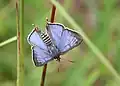 The lilac silverline has been recorded from a wide variety of habitats that include protected wildlife reserves such as the Daying Ering Wildlife Sanctuary and Kumbhalgarh Wildlife Reserve, restored institutional campus such as the Agastya Campus in Chitoor, and open plains and gram fields in Uttar Pradesh.[5] In all locations, except at Hessarghatta Lake, very small numbers of the species have been observed, with many observations being one individual. The lilac silverline has been sighted in relatively undisturbed reserves, but a majority of the sightings have been in areas that experience human activities such as grazing, agriculture, and regular visitations by bird photographers.[5][7] Caterpillars of lilac silverline are tended by ants that offer protection from predators and parasitoids.[8]