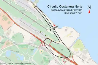 The Circuito Costanera (commonly known as the Costanera Circuit), was a Grand Prix circuit in Buenos Aires (Argentina). Two variants are known to have existed under Circuito "Avenida" Costanera and Costanera "Sur" which are listed by a few data sources as circuits used for the 1930, 1932 and 1936 Buenos Aires races.[1][2][3][4] Verifiable records can only confirm the Costanera Norte circuit layouts for the 1951 V Gran Premio General Perón (Feb. 18), V Gran Premio Eva Perón (Feb. 25), Gran Premio Eva Perón (Ciudad) Sport (March 18) and the 1957 1000 km de Buenos Aires.