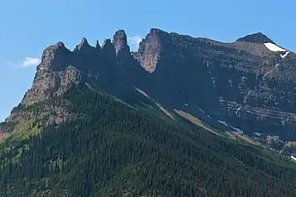 Citadel Peaks is a mountain ridge located in the Goat Haunt area of Glacier National Park, in Glacier County of the U.S. state of Montana.[2] This arête with a row of sharp points is part of the Livingston Range, and is approximately four miles east of the Continental Divide.[5] Neighbors include Olson Mountain, two miles (3.2 km) to the north, Mount Cleveland four miles (6.4 km) to the east, and Kootenai Peak 2.7 miles (4.3 km) to the south. Topographic relief is significant as Citadel Peaks rises over 3,800 feet (1,200 meters) above Waterton Lake in less than two miles, and 3,000 feet (910 meters) above Lake Janet in one mile. Precipitation runoff from the mountain drains to the south end of Waterton Lake. The first ascent of Citadel Spire, a major pinnacle on the ridge, was made in 1967 by Jerry Kanzler, Jim Kanzler, Ray Martin, and Clare Pogreba.[6] This geographical feature's name was officially adopted in 1929 by the United States Board on Geographic Names.[2] To the Pikuni people, Citadel Peaks is known as "Ataniawxis", meaning "The Needles".[7]