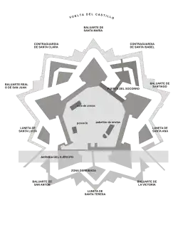 The denominations of the bastions are: San Antón, el Real, Santa María, Santiago and Victoria.