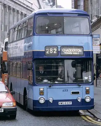 Citibus' original bus fleet consisted of Leyland Panthers new to Isle of Man Transport in a light blue and black livery.[3] From 1988 onwards these were replaced by Leyland Atlanteans, most of which were new to South Yorkshire Transport, and the livery was changed to two-tone blue.[4] Under Lynton Travel ownership a few vehicles were transferred from County Bus & Coach, including a number of Mercedes-Benz 0709D minibuses, but few Citibus vehicles survived long after sale to GM Buses.[2]