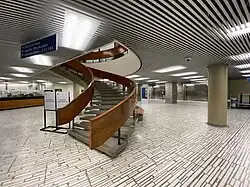 Upon entering the building through the front doors, the lobby is a large and unique rotunda. Central to the rotunda is the massive circular support column for the Council chambers, surrounded on three sides by the "Hall of Memory". A few steps down, there is a glass bookcase that holds two books of remembrance on occasion, engraved with the names of servicemen and women from Toronto who died during the two world wars. White plaques on the wall around the hall display the insignia of military units headquartered in Toronto since 1793.[44] Inscribed on a support column in the lobby is architect Revell's name, and on one wall there is the mural Metropolis, made entirely of nails.[44]