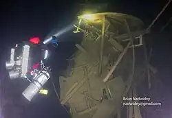 August 2023-Diver Johnny Ryan on the wheel of the City of Ainsworth. 110m depth (360ft)