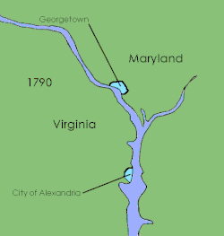 Congress determined, in the Residence Act of 1790, that the nation's capital be on the Potomac, between the Anacostia River and today's Williamsport, Maryland, and in a federal district up to 10 miles square. The exact location was to be determined by President George Washington, familiar with the area from his nearby home and properties at Mt. Vernon, Virginia.