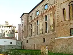 In 1668, during the period of greatest splendour of the Duchy of Mirandola, Duke Alessandro II Pico order to build the Galleria Nuova (New Gallery) in the centre of the castle of the Pico, frescoed by Biagio Falcieri and arranged to house the precious picture gallery composed of over 300 works of art by extraordinary artists such as Leonardo da Vinci, Raphael, Caravaggio, Titian, and many others, purchased in Verona in 1688.[3] Many of these masterpieces were lost with the devastating burst of the keep in 1714, while other works (including many portraits of the Pico family and paintings from the World Age and History of Psyche cycles by Sante Peranda) were taken away to the Ducal Palace of Mantua, where they are still found; other works are on display at the Galleria Estense in Modena.