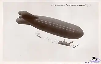 The Clément-Bayard No.1, Bayard-Clément[1] was a French military semi-rigid airship of 1908 developed by Astra Clément-Bayard, which was founded by industrial entrepreneur Adolphe Clément-Bayard, in response to a French Army decision to experiment with airship operations. Société Astra was contracted to build the envelope, while Clément-Bayard built the gondola and engines itself. The envelope's distinctive design featured four large lobes at the aft end, intended to provide directional stability. Testing commenced on 29 October with Henry Kapferer at the controls.[1] By the end of the year, the airship had made nearly thirty flights, including long-range cross-country sorties of up to 200 km (120 mi), breaking the national aerial endurance and speed records.