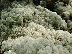 Cladonia stellaris (star-tipped cup lichen[1] or star reindeer lichen[2]) is an ecologically important species of cup lichen that forms continuous mats over large areas of the ground in boreal and arctic regions around the circumpolar north. The species is a preferred food source of reindeer and caribou during the winter months,[3][4][5] and it has an important role in regulating nutrient cycling and soil microbiological communities.[6] Like many other lichens, Cladonia stellaris is used by humans directly for its chemical properties, as many of the secondary metabolites are antimicrobial (e.g., Usnic acid), but it also has the unique distinction of being harvested and sold as 'fake trees' for model train displays.[7] It is also used as a sound absorber in interior design.[8] The fungal portion of Cladonia stellaris, known as a mycobiont, protects the lichen from lichenivores, superfluous solar radiation, and other kinds of stressors in their ecosystem.[9]
