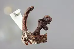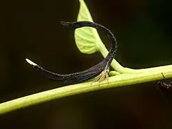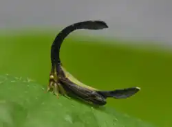The genus is distinguished from other treehoppers by its highly elaborate pronotum, which in many species bears an elongated, curved anterior process or an ornate intermediate process, giving them an appearance variously called "grotesque" and "particularly charismatic".[5][6] Resembling various natural elements from twigs, leaves and seeds to bird droppings, the pronotum is believed to help them camouflage in their natural habitat. Other explanations for the pronotum's structure include mate recognition, as well as providing an extended surface area for their sensory setae.[7][1] While a popular hypothesis, the use of the pronotum for camouflage has not yet been empirically tested as of 2020.[6] Despite their seemingly burdensome pronota, Cladonota treehoppers are capable of both jumping and flying.[8]