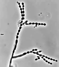 Like many other black yeasts, C. carrionii is sensitive to temperatures above 37 °C.[6] It can be distinguished in culture by the presence of its urease enzyme hydrolyzing urea[9] and its inability to liquefy gelatin.[7][10] Altering temperatures or micronutrient levels such as calcium and phosphate affects whether C. carrionii is in the mycelial or muriform state.[2] The fungus transforms to muriform cells under conditions of temperature between 25 °C to 37 °C, 0.1 mM Ca2+, and a pH of 2.5.[8] It produces multiple conidia in long, straight chains that bud off the hyphae, with the youngest conidia farthest from the hyphae.[2] There is no sexual state known for C. carrionii.[6]