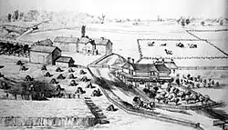 The original hamlet was established in 1850 at the five-point intersection of Albion Road, Indian Line (later incorporated into Highway 50 and Highway 427), and Steeles Avenue. It was built on a land owned by Jean du Petit Pont de la Haye (1799-1872), a French teacher at Upper Canada College. He developed the community on his estate which he named after his daughter Claire Elizabeth (later Berthon b. 1831-d. 1903).[1] A private street was built diagonally across northern Etobicoke as a shortcut to Albion Township through Toronto Gore Township (now part of Caledon and Brampton), with a toll at Claireville. The road was originally named Claireville but was also called the Albion Road (the current name for the street).[2]