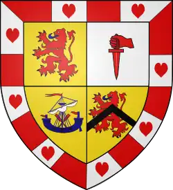 ![]() Crest: A demi-cat-a-mountain rampant guardant Proper, grasping in his dexter paw a serpent Vert, langued Gules, its tail environing the sinister paw | |||