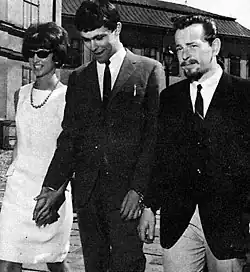 ![]() Olofsson on his way to court in 1967, with his fiancée at the time (left) and cuffed to a policeman (right) | |