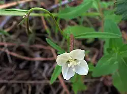 Clarkia epilobioides is a species of flowering plant in the evening primrose family known by the common name canyon clarkia. It is native to California, Arizona, and Baja California, where it grows in shaded habitat in woodland and chaparral. It is an annual herb producing a slender, erect stem sometimes exceeding half a meter in height. The leaves are narrowly to widely lance-shaped and less than 3 centimeters long. The top of the stem is occupied by the inflorescence. Each hanging bud has four red sepals which remain fused all together or in pairs as the petals emerge during blooming. The petals are one half to one centimeter long, oval in shape, solid white or cream in color, often fading pink as they age. There are eight protruding stamens and one stigma.
